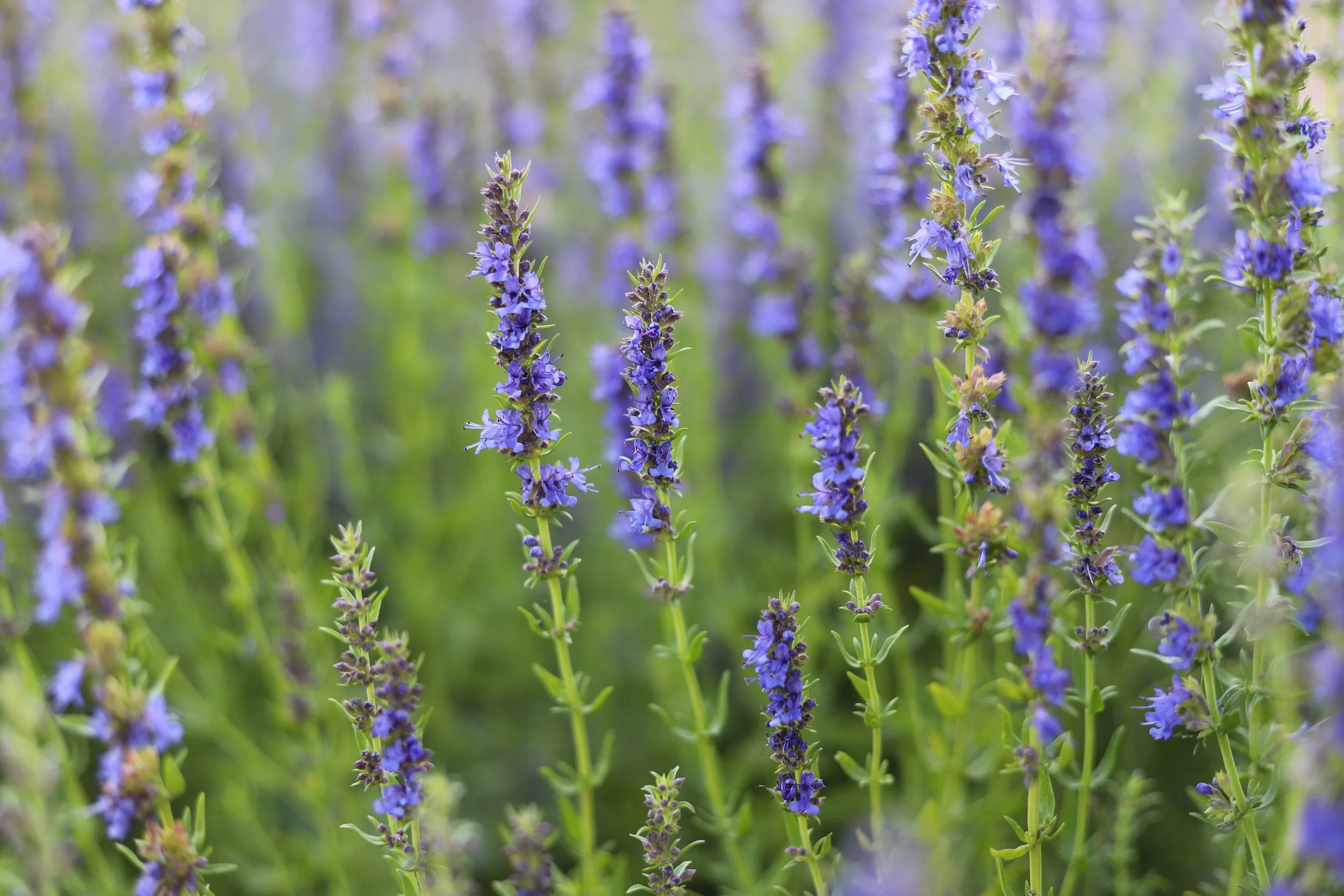 Hyssop is a woody perennial native to southern Europe, preferring dry, sunny conditions. It bears narrow leaves and blue-purple flowers.